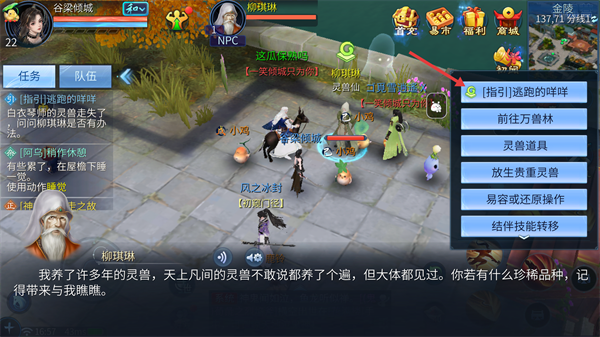 2、与柳琪琳对话,点击【[指引]逃跑的咩咩】,获取任务线索。