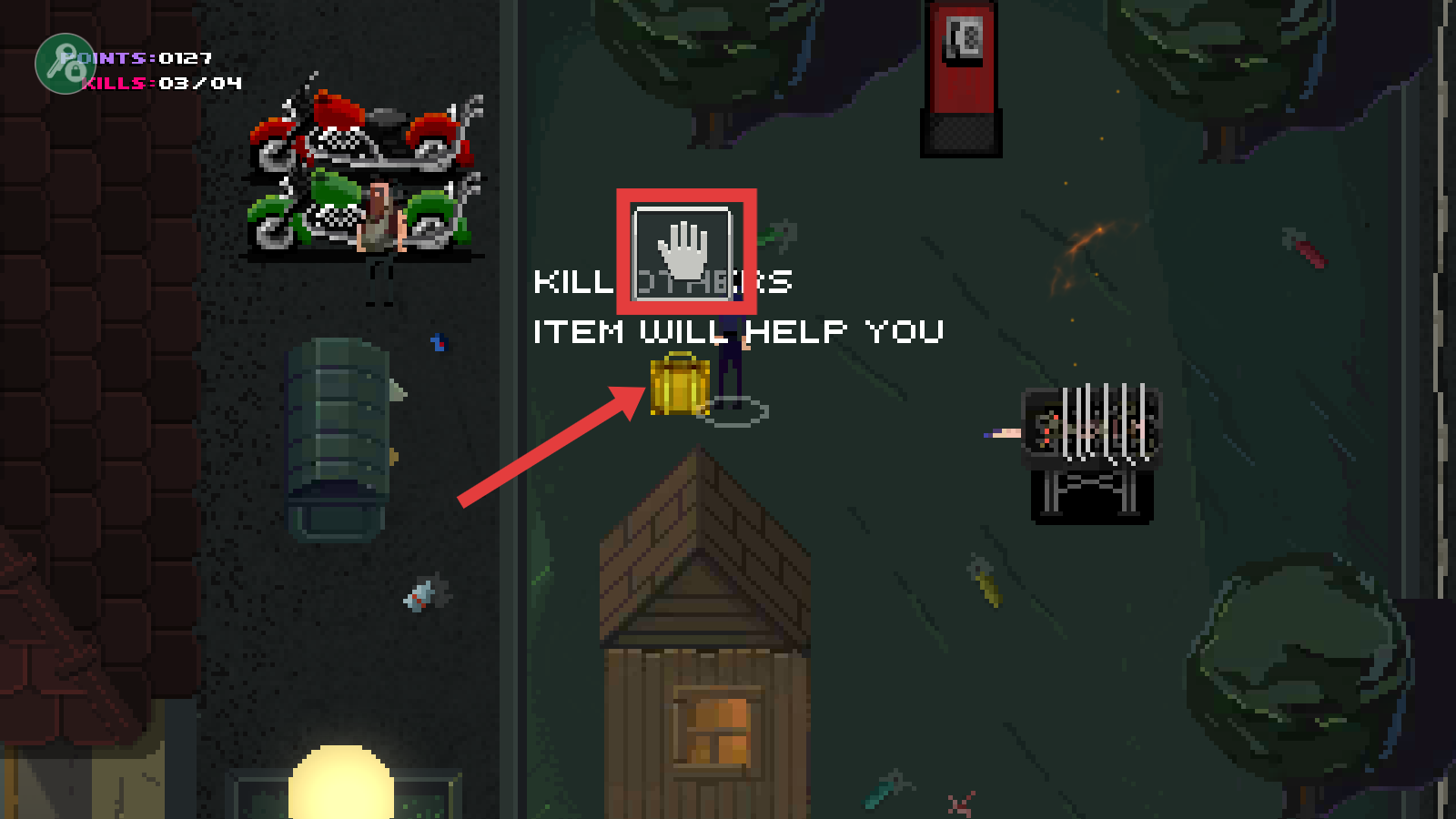 1、靠近金色箱子,点击交互拾取物品,借助【KILL-OTHERS】提示,利用道具助力刺杀。
