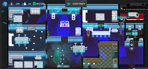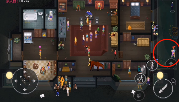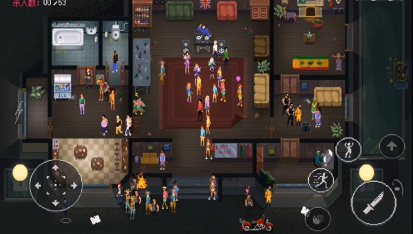 游戏首先会有个教学关卡,目的就是让玩家先通过自己的武器(小刀)以及合理的利用全屏地图的各种陷阱杀死所有参加聚会的人。这样把全部人都搞定之后就算完成本关挑战,进入下一关。