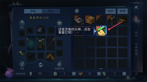 1、获得灵兽元神后,点击【包裹】图标。