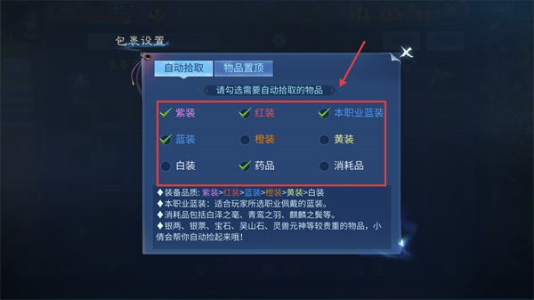 3、在【自动拾取】界面,勾选需要自动拾取的物品,优化拾取效率。
