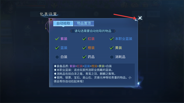 4、完成自动拾取物品勾选后,点击关闭按钮,保存设置。