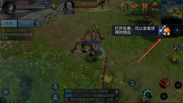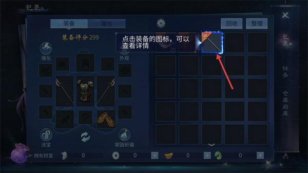 2、进入包裹界面后,点击装备图标,查看装备属性信息。