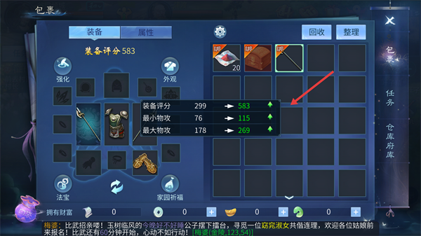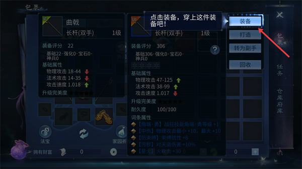 3、点击【装备】按钮,穿上新装备,提升角色战力。