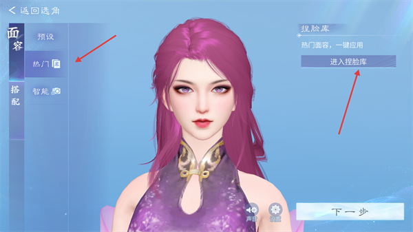 1、在面容设置界面,可点击点击【热门】分类,选择【进入捏脸库】。