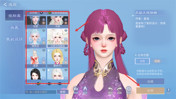 2、在捏脸库中挑选心仪面容,点击【应用】即可使用该面容。