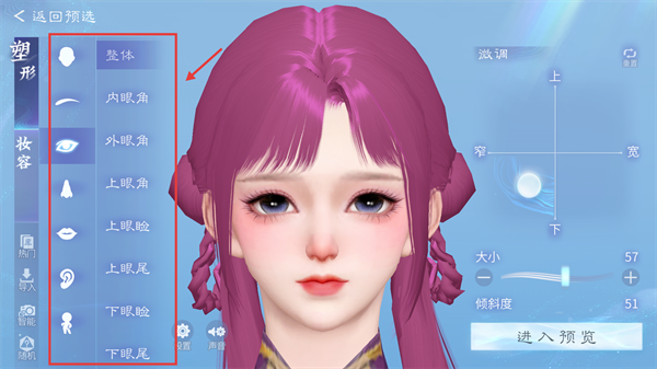 3、进入塑形界面,可对【内眼角】【外眼角】等多项面部细节进行精细调整,打造独特形象。