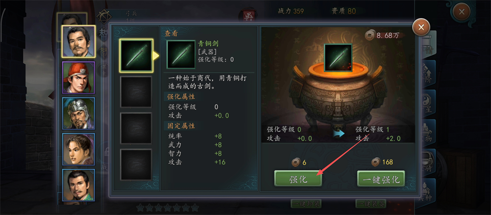 2、进入青铜剑强化界面后,点击【强化】,消耗资源提升装备属性,增强诸葛瑾的作战能力。