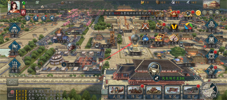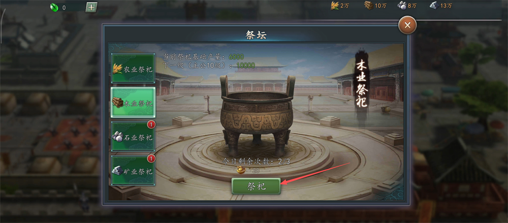 1、大殿达6级后解锁【祭坛】,快去祭祀获取资源,这是快速积累粮食、木材等的好途径哦。