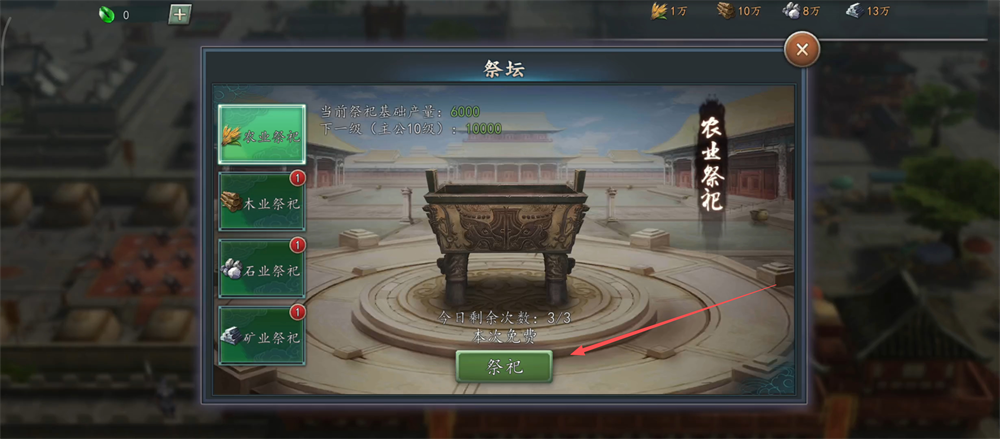 2、进入【祭坛】选农业祭祀,点击祭祀按钮,把免费次数用完,粮食资源就能轻松到手啦。