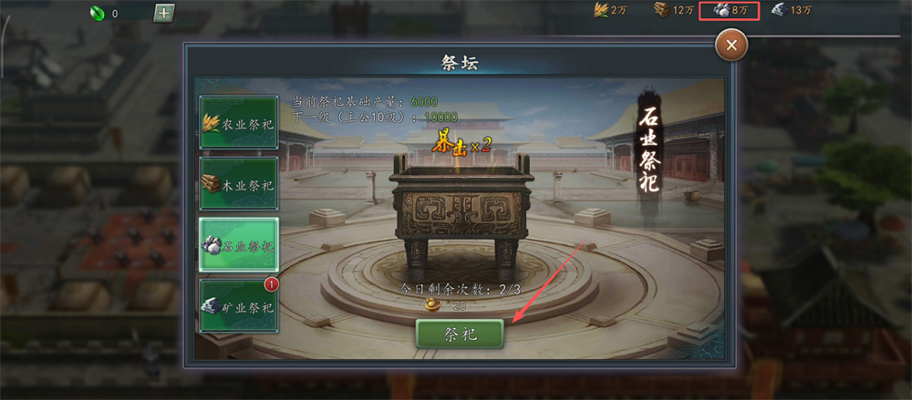 4、选石业祭祀,祭祀时或触发暴击翻倍,多攒石料用于建筑和技法研究,资源积累就靠它啦。