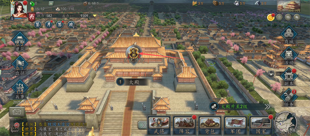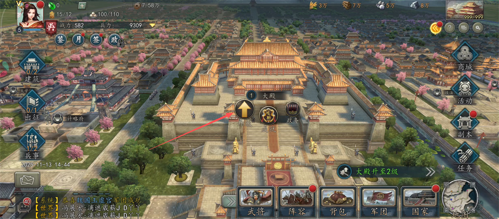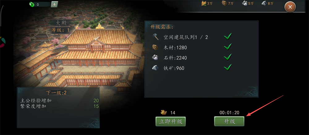 3、接着点击大殿的【升级】按钮,消耗资源提升大殿等级,解锁更多建筑位。