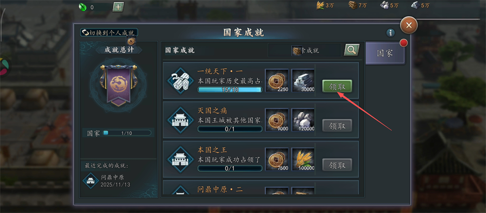 2、进入【国家成就】界面,领取【一统天下】奖励,获取货币与木材。