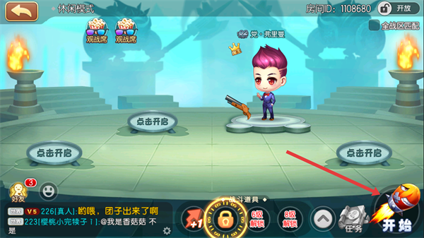 1、进入休闲模式房间,点击右下角【开始】按钮即可开启弹射对战,可邀请好友或匹配对手参与。