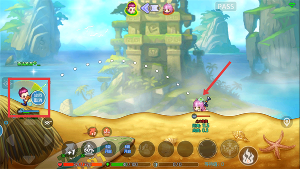 2、战斗中调整左侧角度轮盘瞄准敌人,若角度有误可点击【放回取消】重新调整。