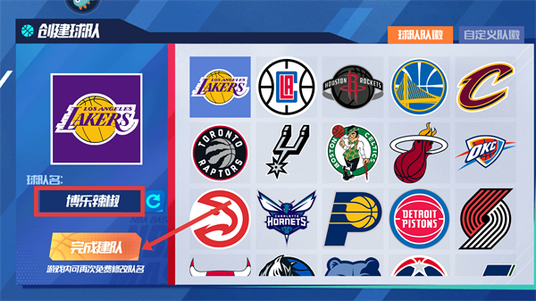 1、创建球队时,选择球队队徽,输入球队名后点击【完成建队】,即可开启篮球竞技之旅。