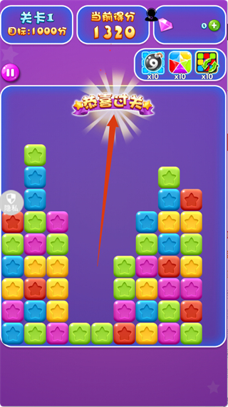 3、当分数达到目标后,将触发【恭喜过关】提示,完成【关卡1】的挑战,可继续进入下一关。