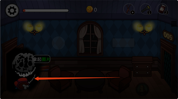 3、在005房间中,注意躲避危险,按照提示【拿起图片】收集关键道具,为后续解谜做准备。