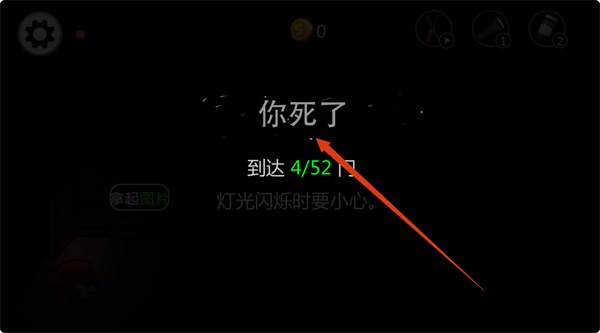 4、若出现【你死了】提示,总结经验,后续在灯光闪烁时提高警惕,调整策略以顺利通过更多房间。