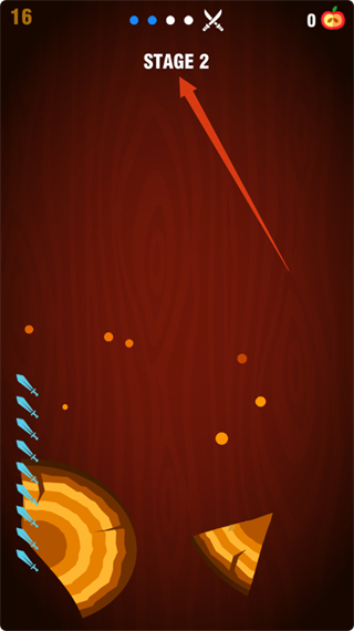 4、完成【STAGE1】后进入【STAGE2】,调整扔刀策略,应对更具挑战性的关卡,继续积累分数。