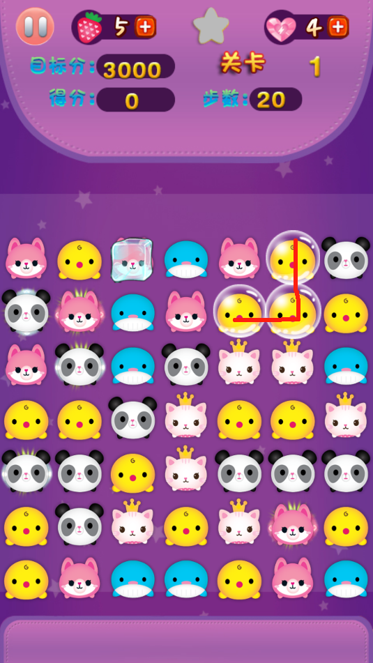 3、游戏中,点击滑动连接相同的动物来消除获得分数,20步数里,需完成3000分数即可通关。