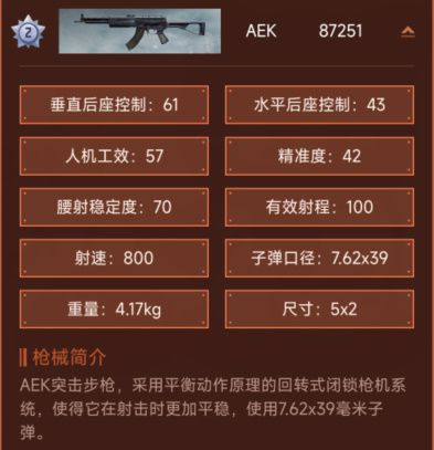 AEK突击步枪,采用平衡动作原理的回转式闭锁枪机系统,使得它在射击时更加平稳,使用7.62x39毫米子弹。