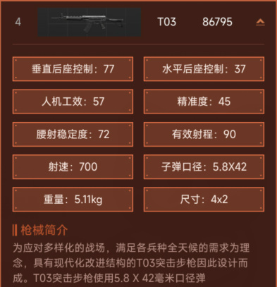 为应对多样化的战场,满足各兵种全天候的需求为理念,具有现代化改进结构的T03突击步枪因此设计而成。T03突击步枪使用5.8×42毫米口径弹。