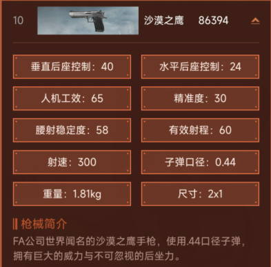 FA公司世界闻名的沙漠之鹰手枪,使用.44口径子弹,拥有巨大的威力与不可忽视的后坐力。