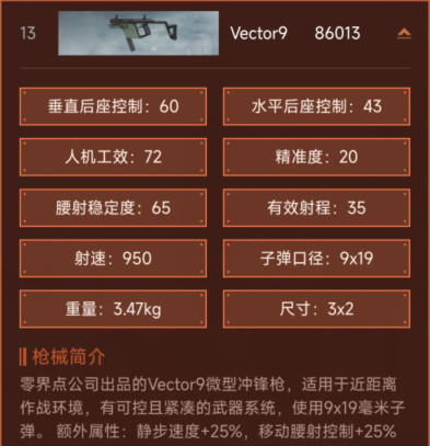 零界点公司出品的Vector9微型冲锋枪,适用于近距离作战环境,有可控且紧凑的武器系统,使用9x19毫米子弹。额外属性:静步速度+25%,移动腰射控制+25%。