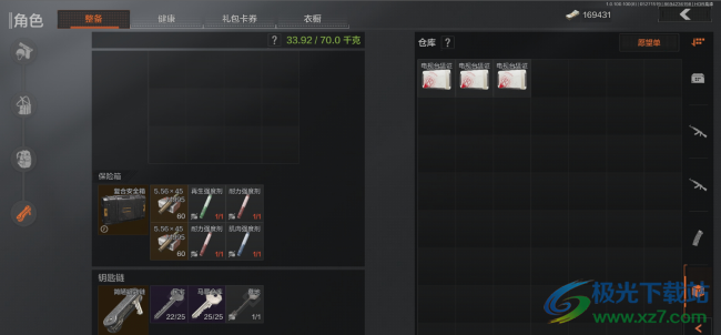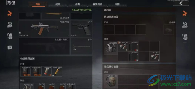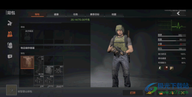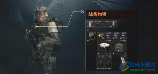完整装备:防具、容器(背包)、武器、补给品,四个类别构成。