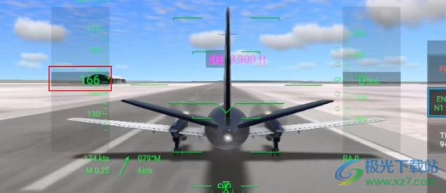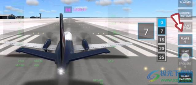 3、第三步起飞,首先确保右下角的手刹是亮的,接着把机翼模式选到7,长按右边的flaps下滑;