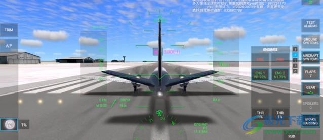 4、最后打开飞机系统中的ENGINES发动机面板,慢慢推动油门到45%左右,松开手刹让飞机滑行持续把油门推到95%,注意不要偏离轨道,系统默认陀螺仪操作;