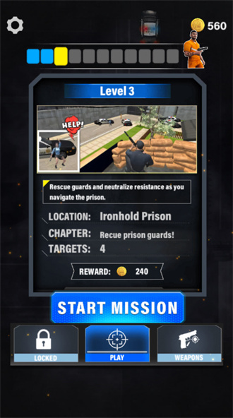 两个不同的角色等你来进行切换使用,手枪近程角色、远程狙击角色随意切换进行战斗,更快速的将所有的敌人消灭。