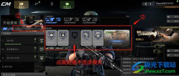6、下面六个则是模式选择,分别是①团队竞技、②个人竞技、③战斗大师(空手开局,击杀获得武器升级)、④武备竞技(类似吃鸡的可复活大乱斗)、⑤爆破模式、⑥仓库(新地图模式);