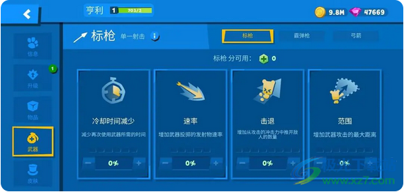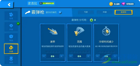 2、霰弹枪:霰弹枪有范围、冷却时间减少、速率这三个培养方向,且都是提升伤害能力的主要因素,霰弹枪比较适合中近距离,适合配合炸弹在近距离对战中来作为补刀武器。