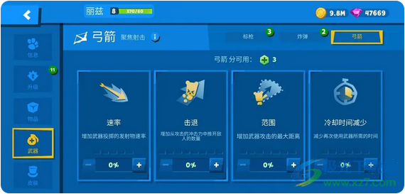 3、弓箭:弓箭也是大部分动物都共有的远程武器,无论是新手还是老司机,想要用好弓箭就需要有比较强的瞄准能力,弓箭技能设有箭雨、多重射击、聚焦射击、连发射击这四种。