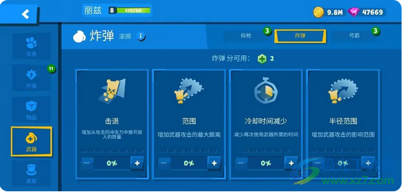 4、炸弹:炸弹有击退、范围、冷却时间减少和半径范围四种培养方向,半径范围和范围区别在于,半径范围是武器伤害的影响范围,是伤害比较明显的武器。