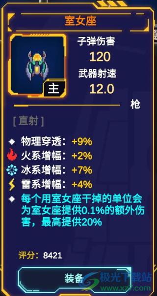 1、室女座:射速极快+击杀单位提升伤害+子弹范围广。