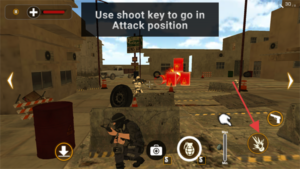 2、根据提示,点击右侧射击键,让角色进入攻击姿态准备作战。