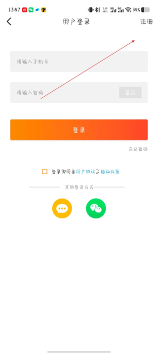 3、在用户登录页面点击右上角注册,进入注册页面。