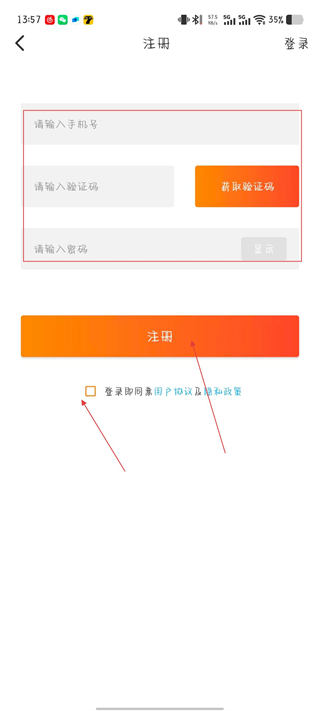 4、输入手机号、验证码和密码,勾选后,完成注册操作。