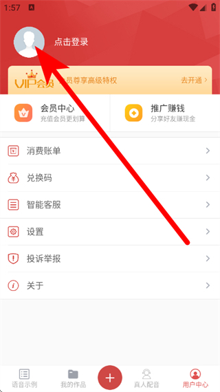 1、打开朗读女配音,在首页点击底部用户中心,进入个人中心页面。