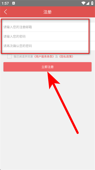 4、输入注册邮箱、密码、再次确认密码,勾选已阅读并同意后,点击立即注册,完成操作。