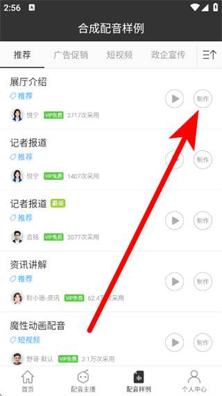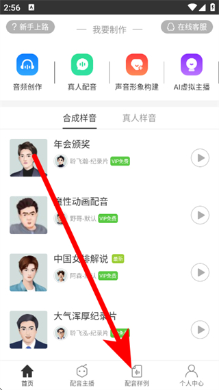1、打开讯飞配音,点击底部配音样例,进入合成配音样例页面。