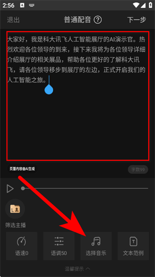 3、在普通配音页面,可编辑文本,还能调整语速、语调、选择音乐等。