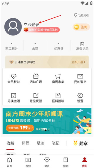 1、打开南方周末APP,点击右下角“我的”,进入个人页面。