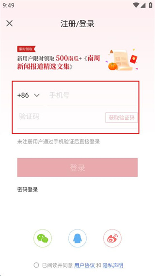 3、在注册/登录界面,输入手机号,获取并填写验证码。