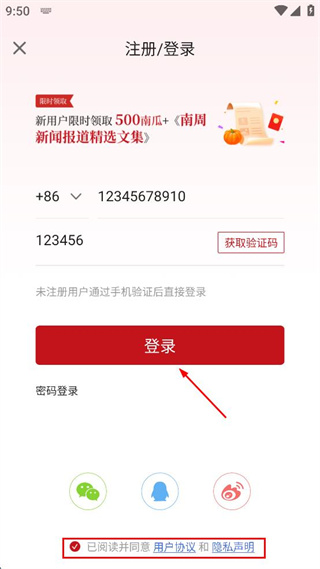4、勾选“已阅读并同意用户协议和隐私声明”,点击“登录”按钮完成登录。