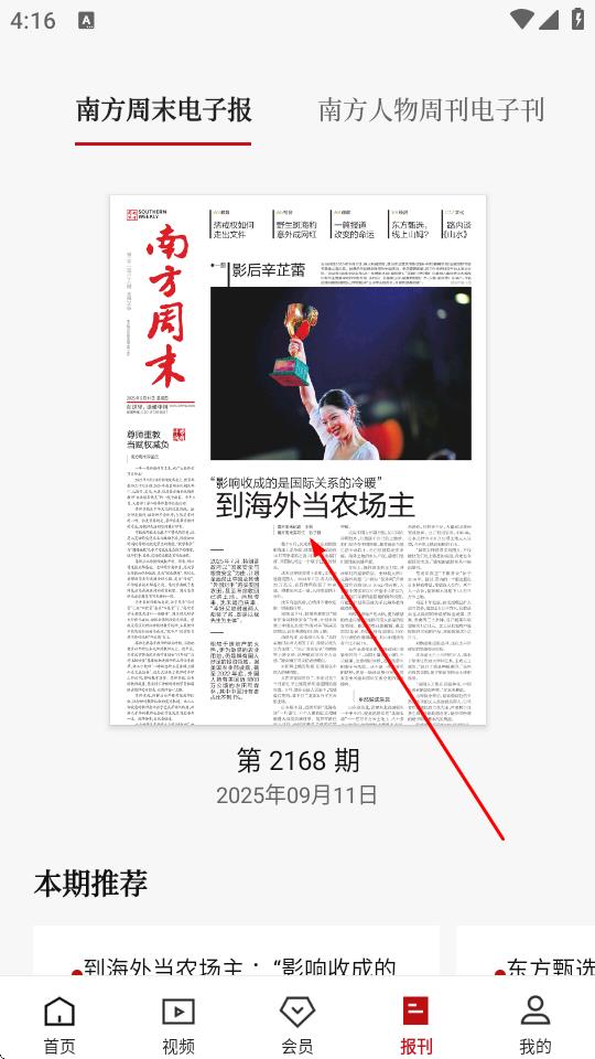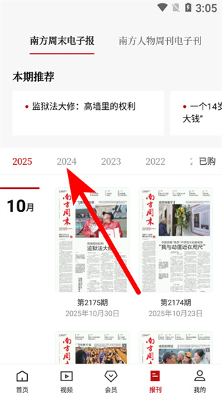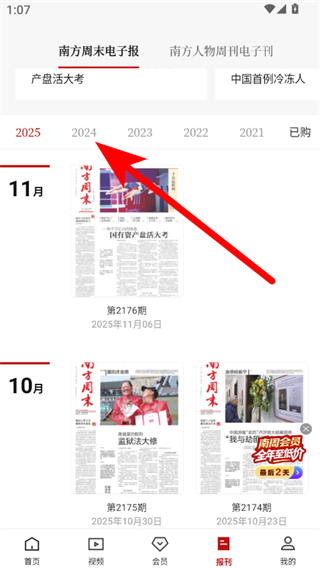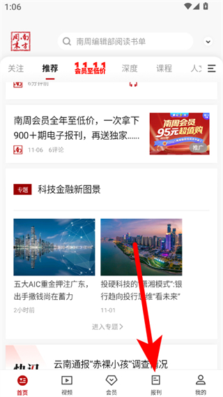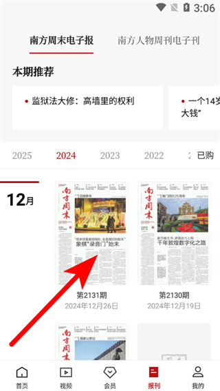 1、在南方周末首页,点击下方报刊选项,进入报刊页面。