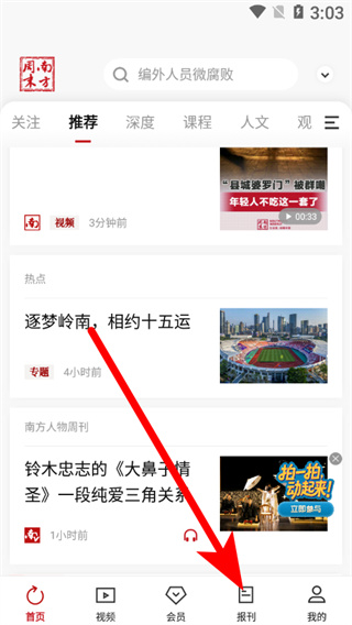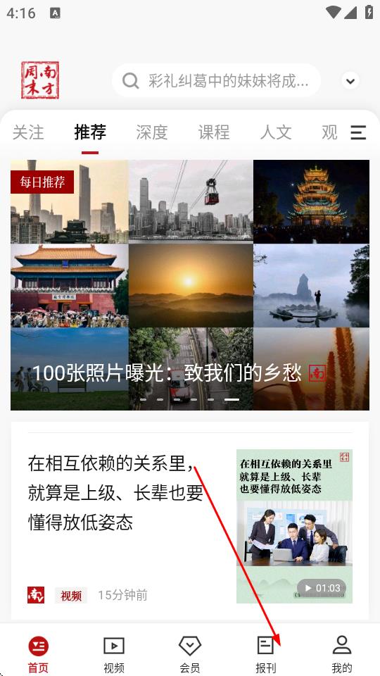 1、打开南方周末App,点击底部导航栏中的报刊选项。